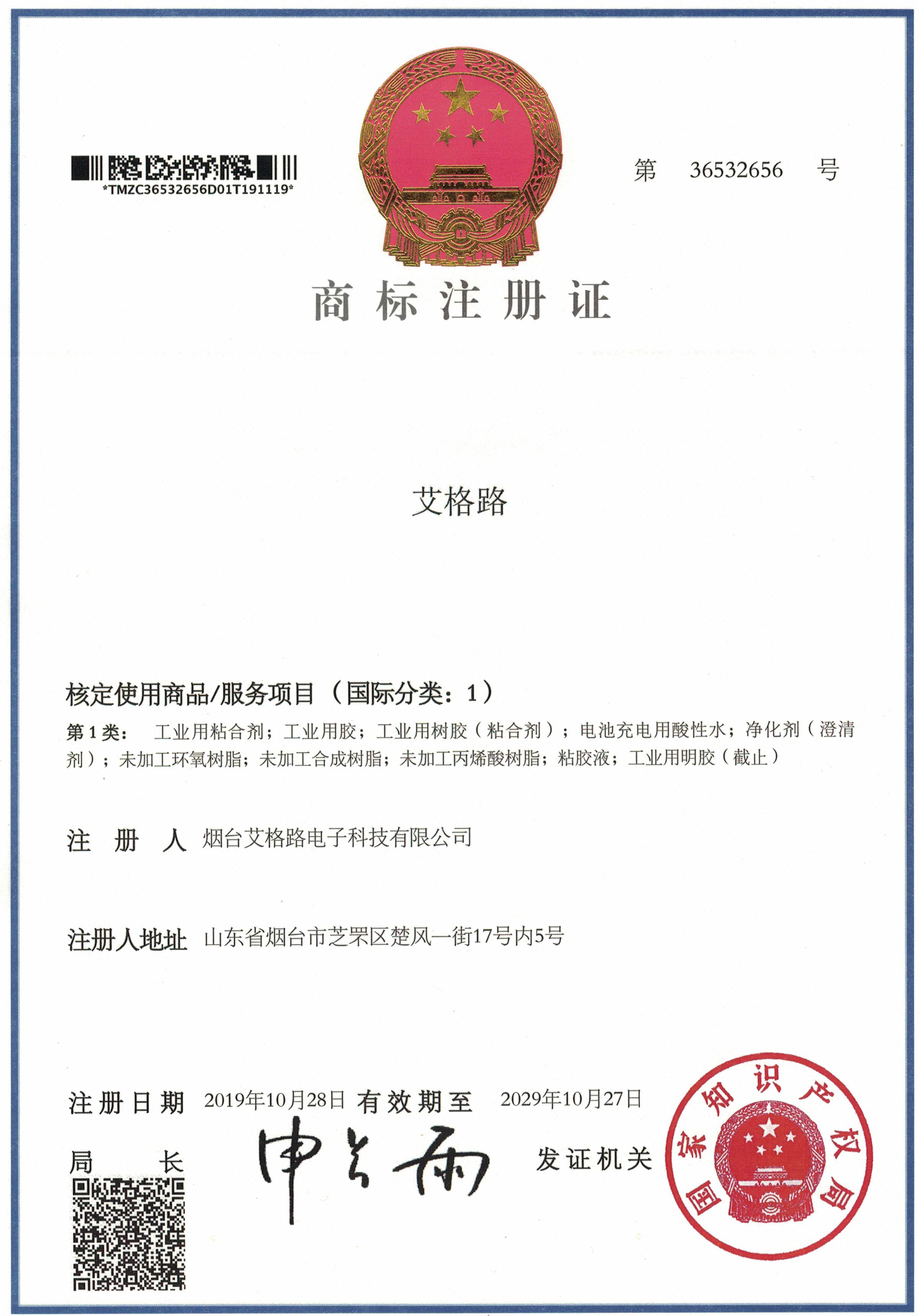 煙臺艾格路電子科技有限公司目前擁有四個注冊商標,分別是:艾格路?、艾斯迪科?,ISITIC?、tempbond?。艾格路解決方案和艾斯迪科品牌粘合劑期待著與您的溝通。